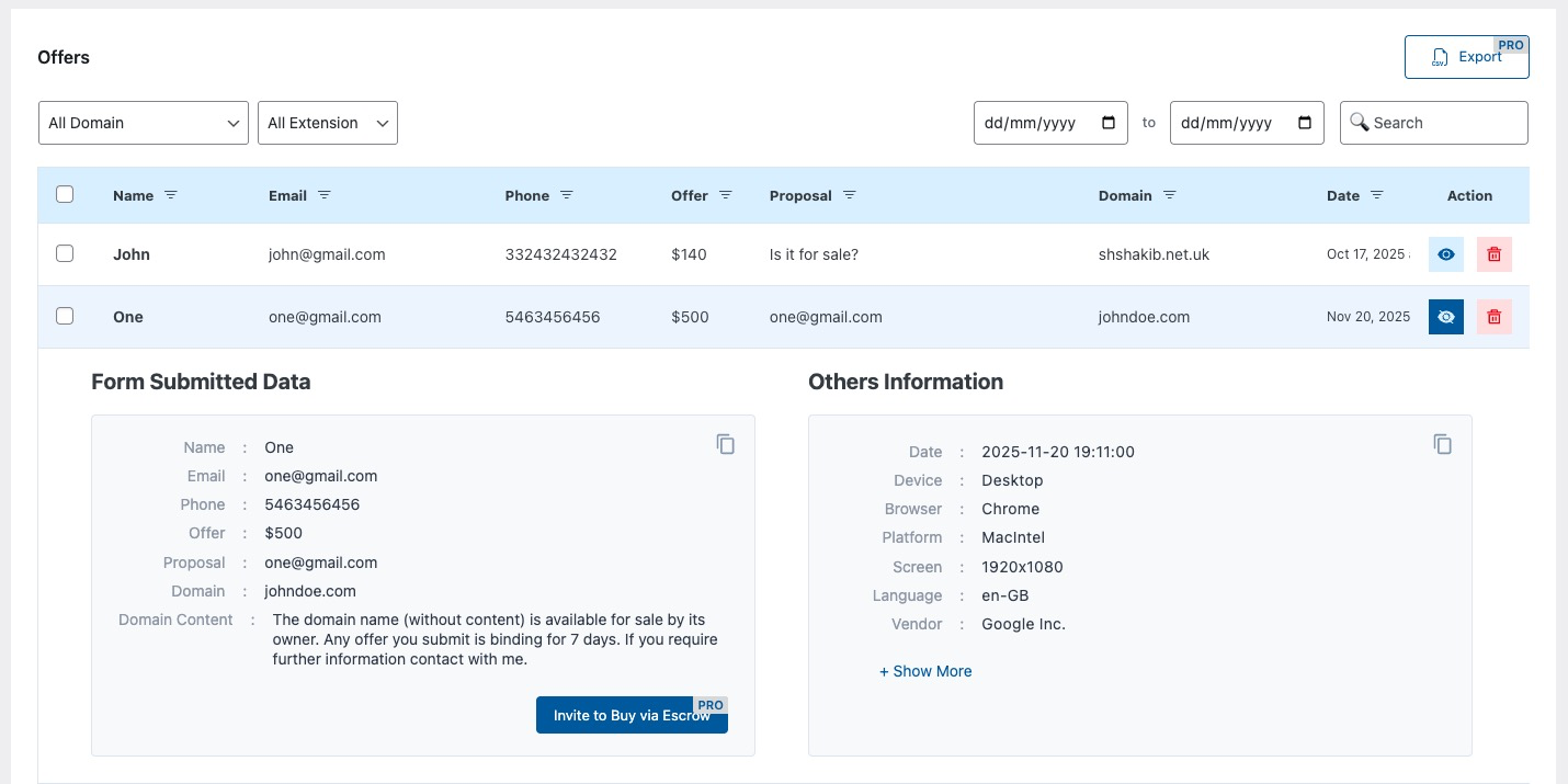 Interested buyers can submit inquiries using the built-in contact form. All submissions are stored in the Offers section of the plugin for easy review, and you can also configure the form to send notifications to your email address. Additionally, there is an option to display your email address and phone number on the page so buyers can contact you directly.